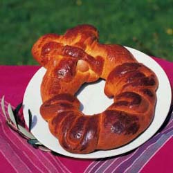 Una volta preparato l’impasto utilizzato per la schiaccia, si lavora fino ad ottenere la forma di ciambella con le estremità incrociate e prolungate rispetto alla chiusura della circonferenza. Nel punto di intersezione si incastona un uovo intero ed infine si cuoce il tutto in forno.