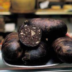 Successivamente si aggiungono all’impasto i lardelli ed il sangue di maiale filtrato; il tutto viene mescolato con aromi e spezie (cannella, chiodi di garofano, noce moscata, sale, pepe, pinoli, uva sultanina). Si insacca l’impasto ancora caldo nel budello naturale di suino (stomaco o vescica), di manzo o di cavallo. Gli insaccati vengono quindi legati e posti in caldaia per un’ulteriore cottura e, quindi, dopo la pressatura, fatti raffreddare rapidamente e conservati in cella frigorifera.