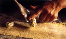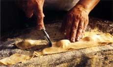 Place a sheet of pasta on a lightly floured work surface. Place 1/2 teaspoon of filling every 3 inches down the length of one side of the pasta sheet. Lightly brush the other side of the sheet with the egg wash. Fold the sheet in half length-wise and press with your fingers along the edges' to seal. Cut around each lump of filling with a pastry wheel into half moon shapes. Set aside on a lightly floured dish towel until ready to cook.
