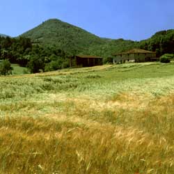 The Mugello valley, which refers to the mid and upper part of the drainage basin of the River Sieve, is a broad valley delimited to the north by the main Apennine watershed (from Monte Citerna to Giogo di Villore), to the south by the spurs of Monte Giovi and Monte Senario, and closed off to the west by the Monti della Calvana, beyond which lies the province of Prato. In the valley are the villages and small towns of Vaglia, San Piero, Barberino Mugello, Scarperia, Borgo San Lorenzo, and Vicchio. The countryside of the Mugello area is quite varied, and includes thick woodland, chestnut coppices, olive groves, wheat and sunflower cultivation. In the fertile valley floor are located the main inhabited areas and lines of communication.